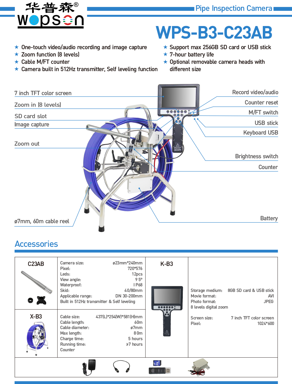 Home > Products > Pipe inspection camera > Dia 30-300mm pipes B3-C23AB