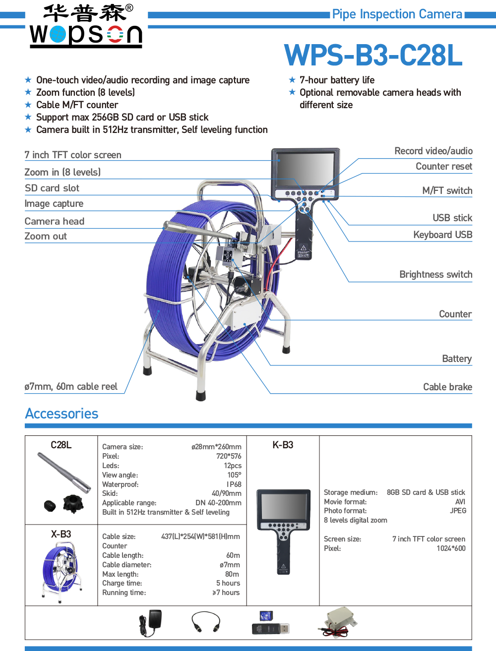 Home > Products > Pipe inspection camera > Dia 30-300mm pipes B3-C28L