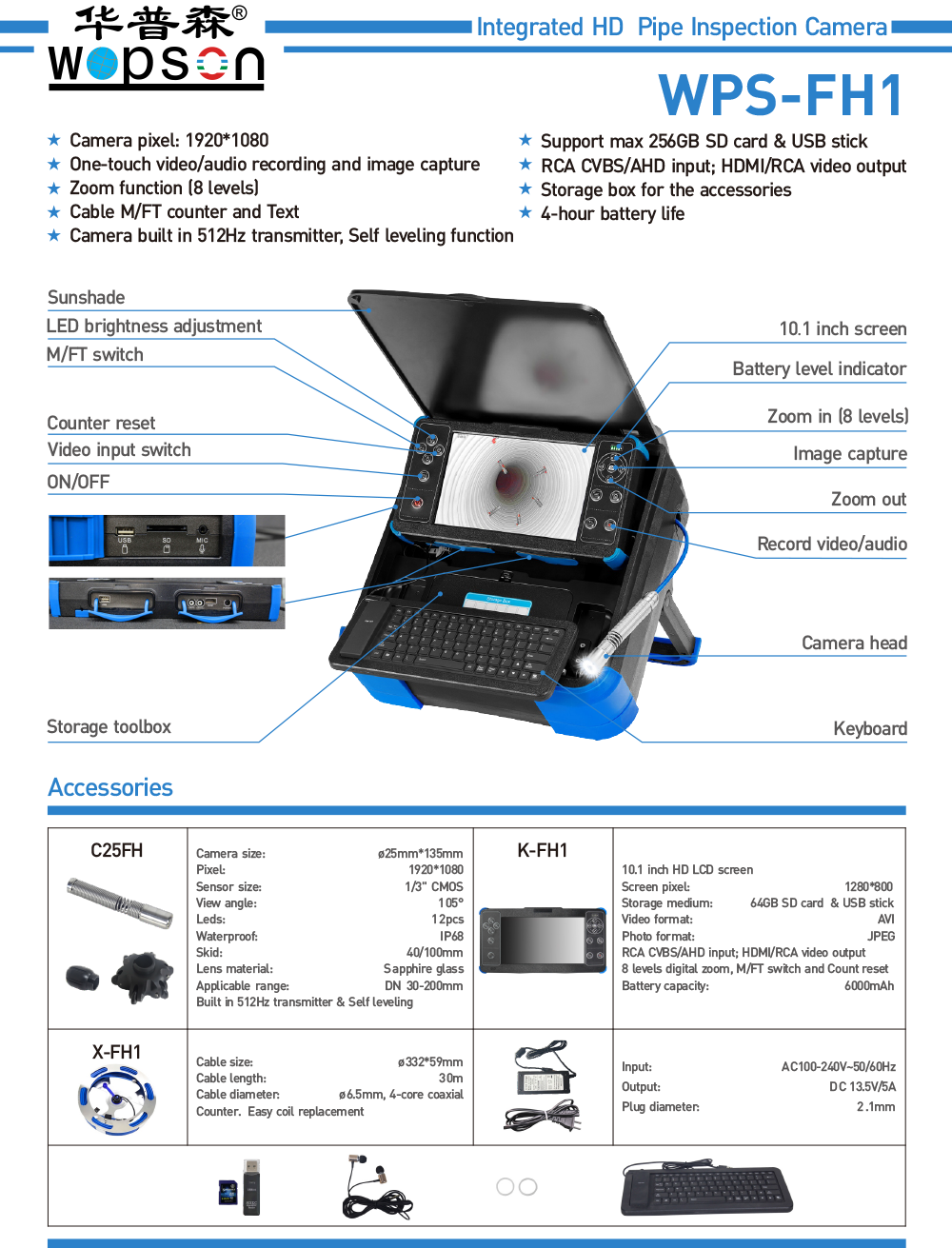 Home > Products > Pipe inspection camera > Dia 30-300mm pipes FH1-C25FH