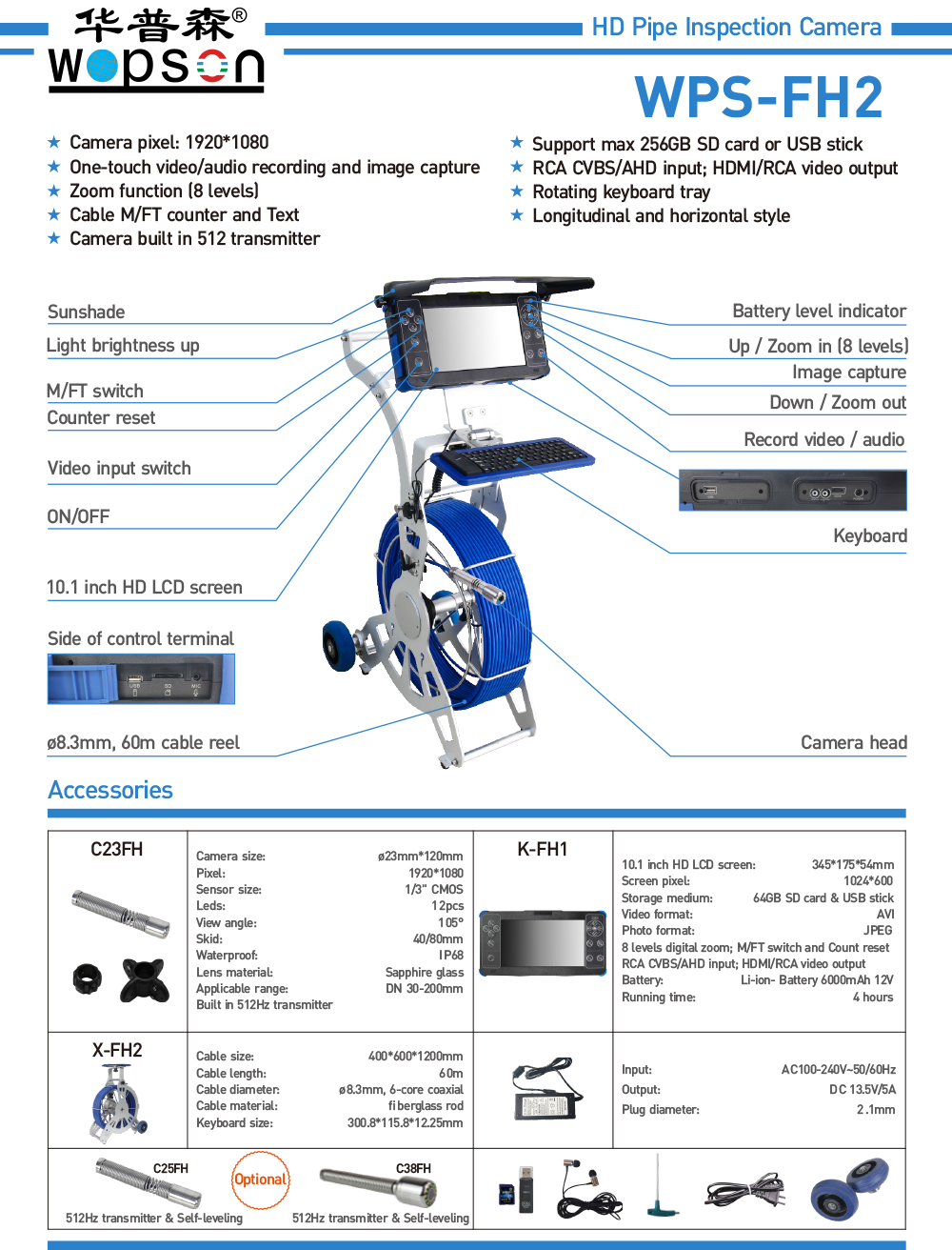 Home > Products > Pipe inspection camera > Dia 30-300mm pipes FH2-C23FH