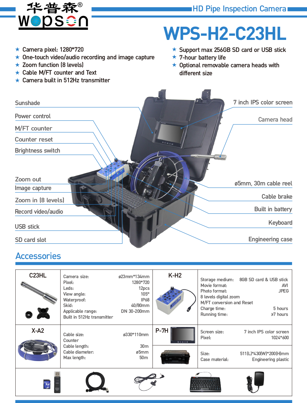 Home > Products > Pipe inspection camera > Dia 30-300mm pipes H2-C23HL