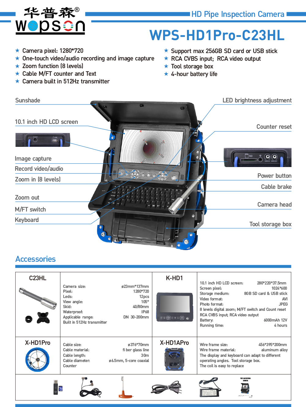 Home > Products > Pipe inspection camera > Dia 30-300mm pipes HD1PRO-C23HL