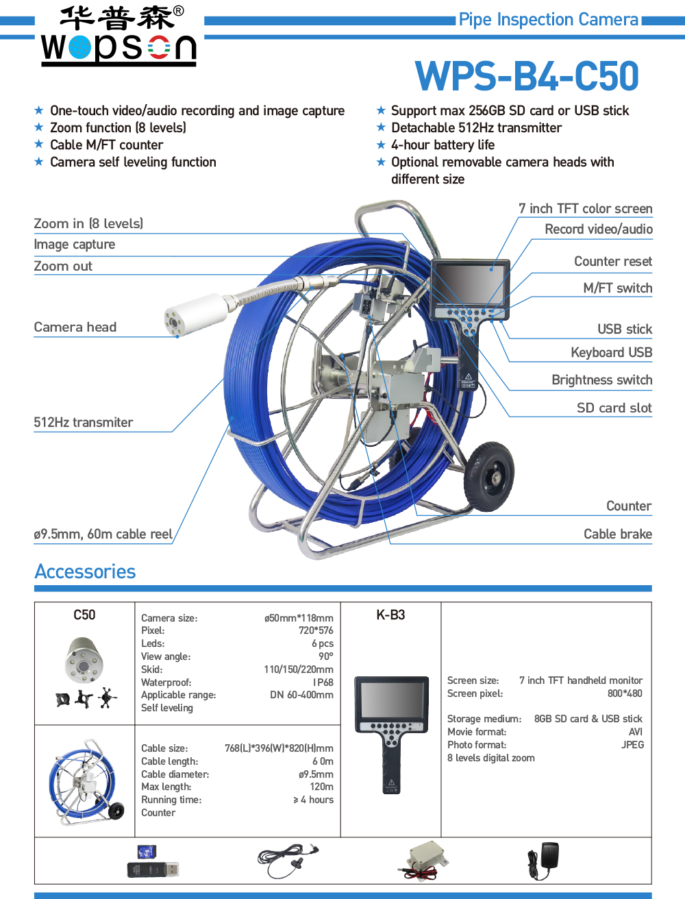Home > Products > Pipe inspection camera > Dia 60-600mm pipes B4-C50