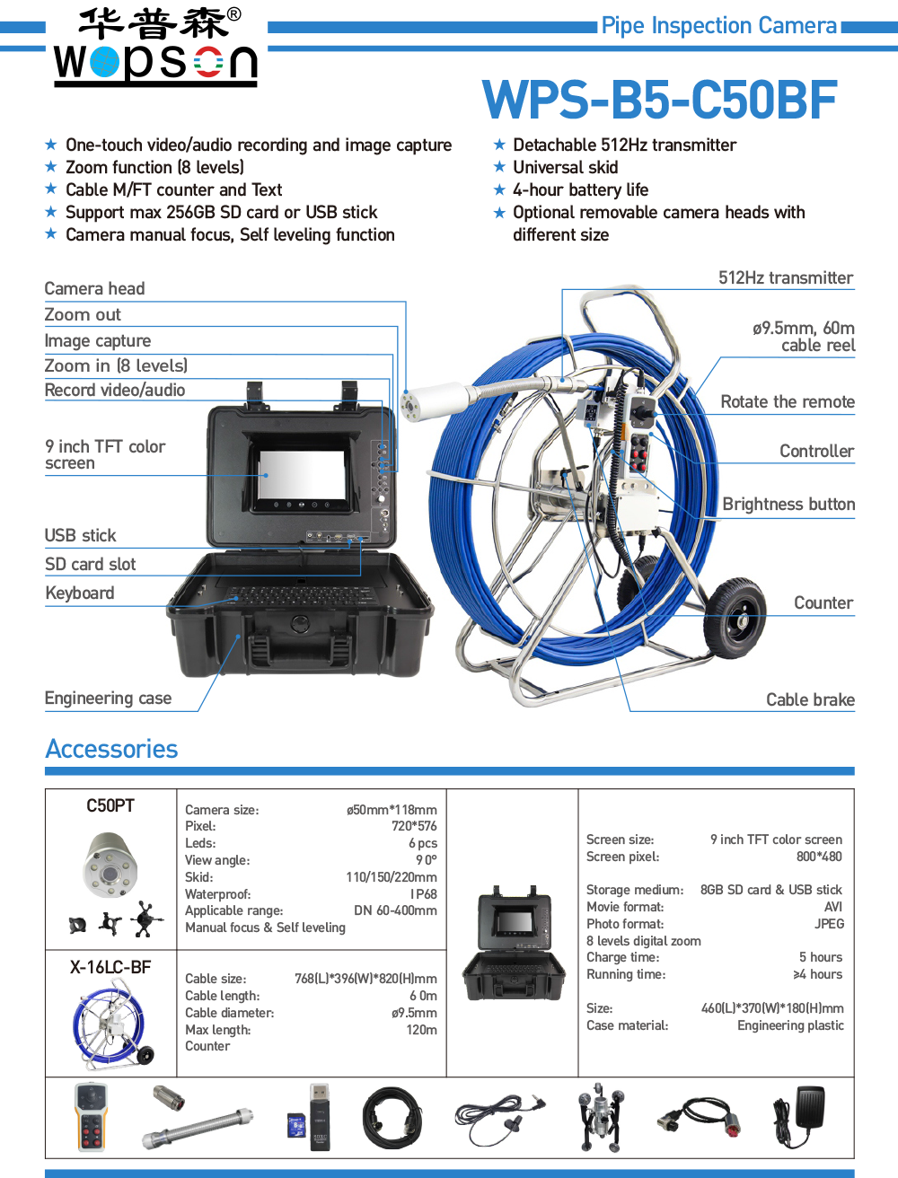 Home > Products > Pipe inspection camera > Dia 60-600mm pipes B5-C50BF