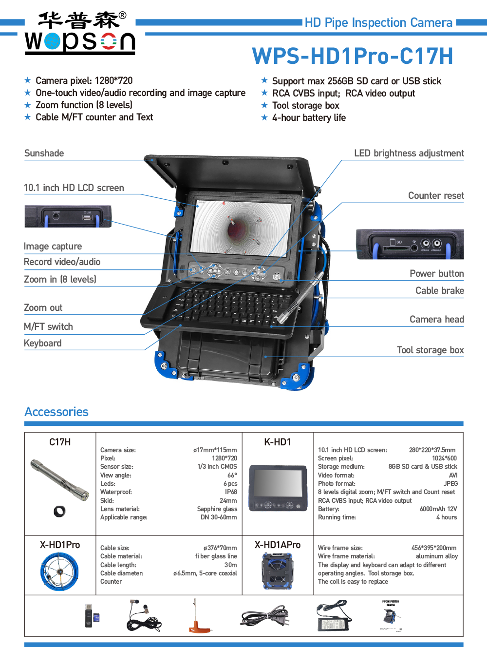 Home > Products > Pipe inspection camera > Dia 10-60mm pipes HD1Pro-C17H