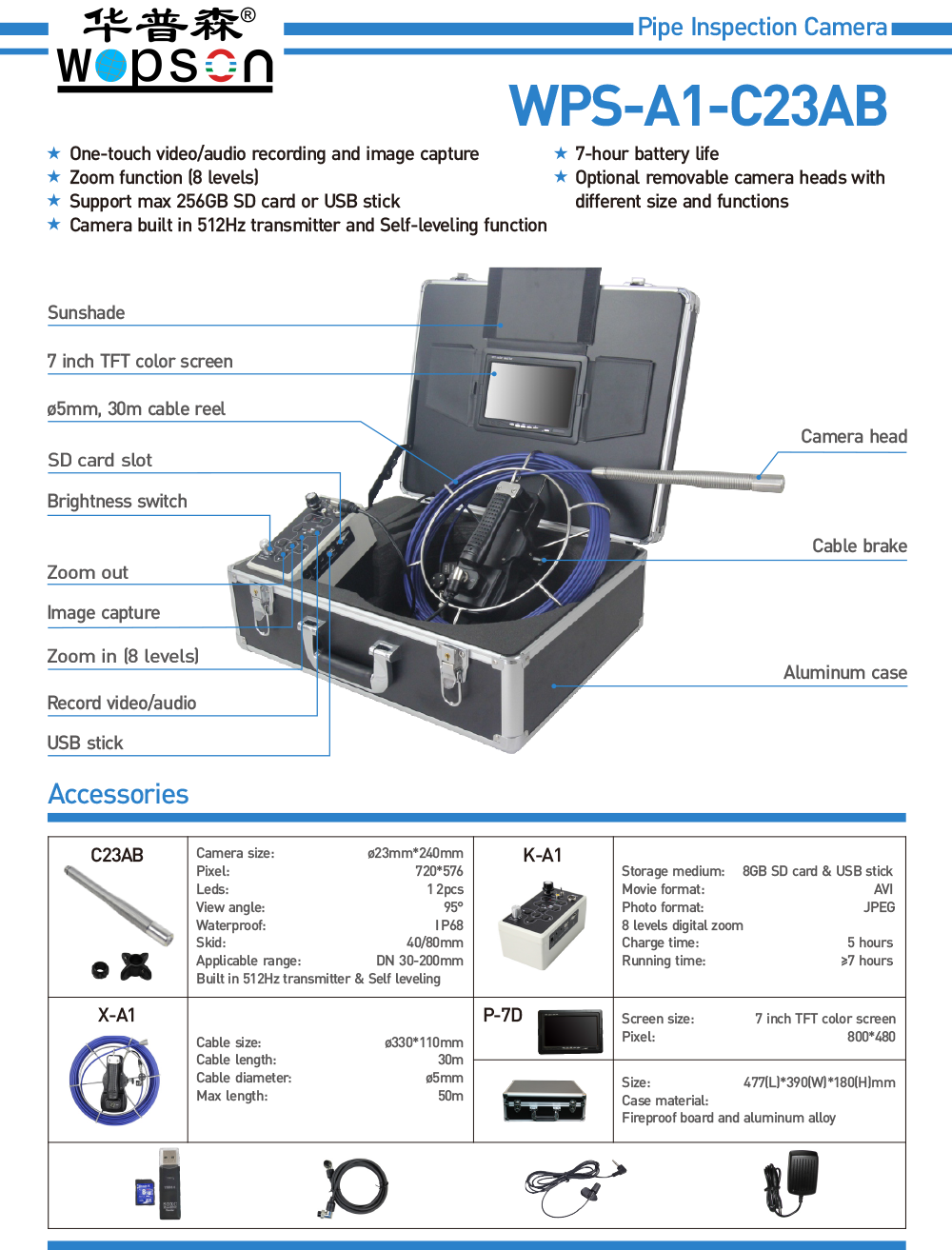 Home > Products > Pipe inspection camera > Dia 30-300mm pipes A1-C23AB