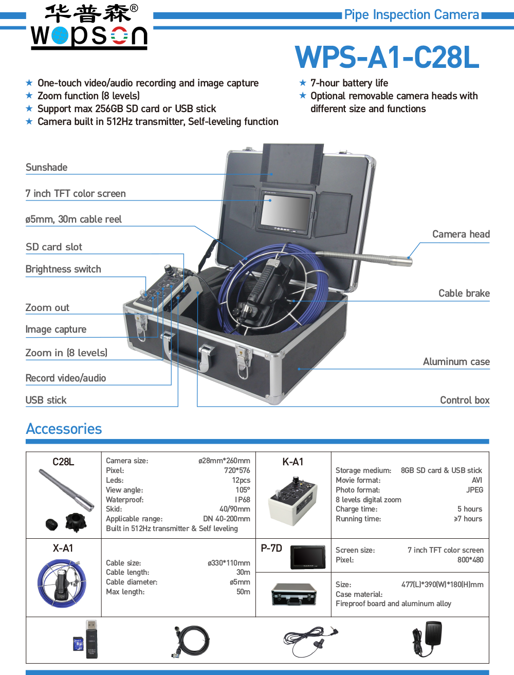 Home > Products > Pipe inspection camera > Dia 30-300mm pipes A1-C28L