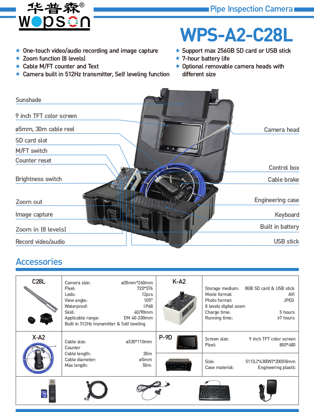 Home > Products > Pipe inspection camera > Dia 30-300mm pipes A2-C28L
