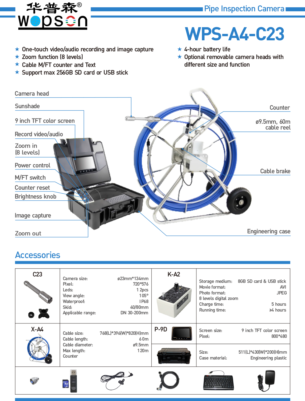 Home > Products > Pipe inspection camera > Dia 30-300mm pipes A4-C23