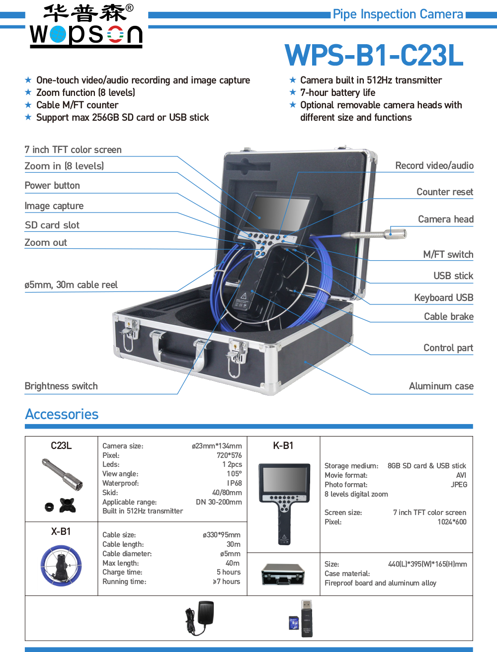Home > Products > Pipe inspection camera > Dia 30-300mm pipes B1-C23L