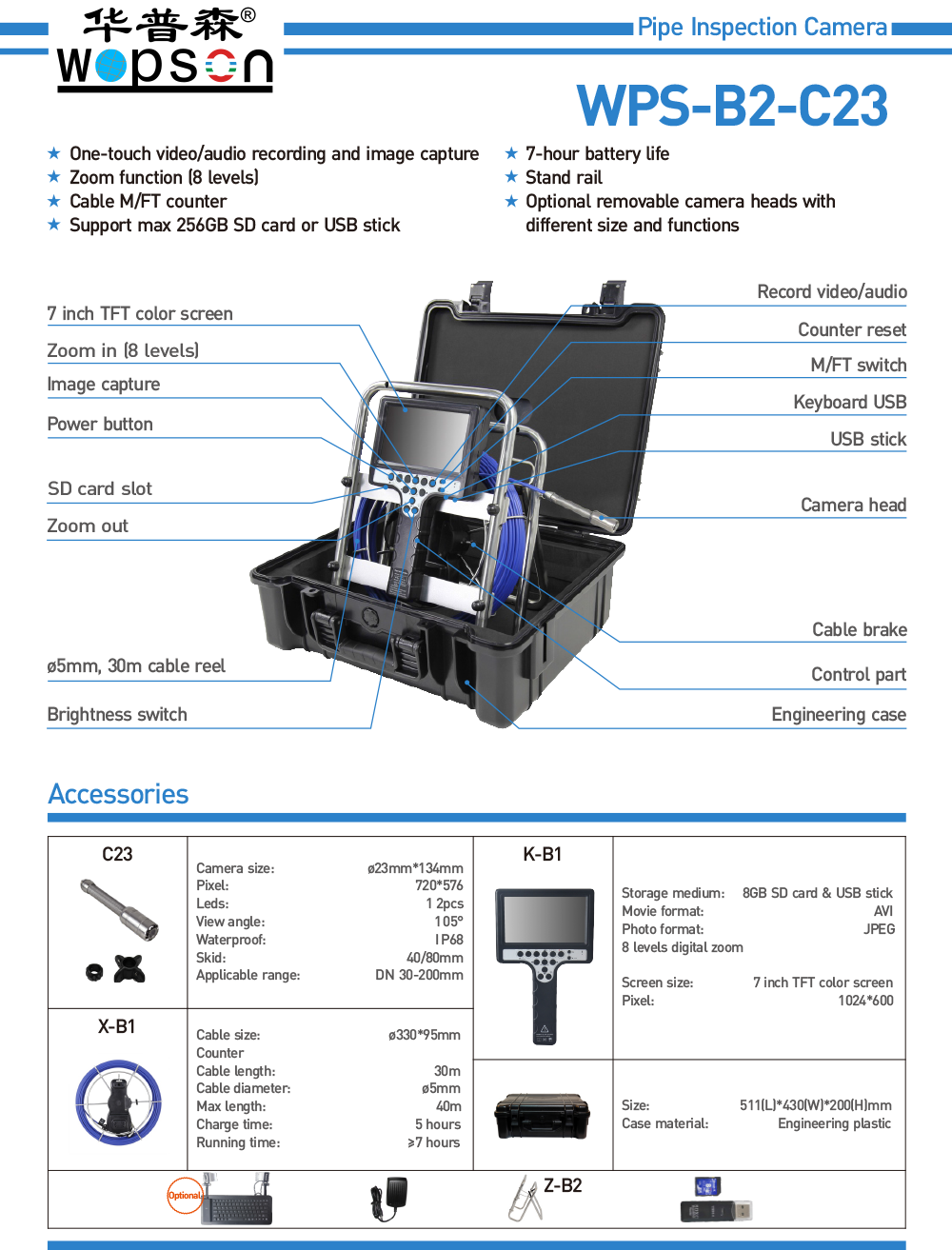 Home > Products > Pipe inspection camera > Dia 30-300mm pipes B2-C23