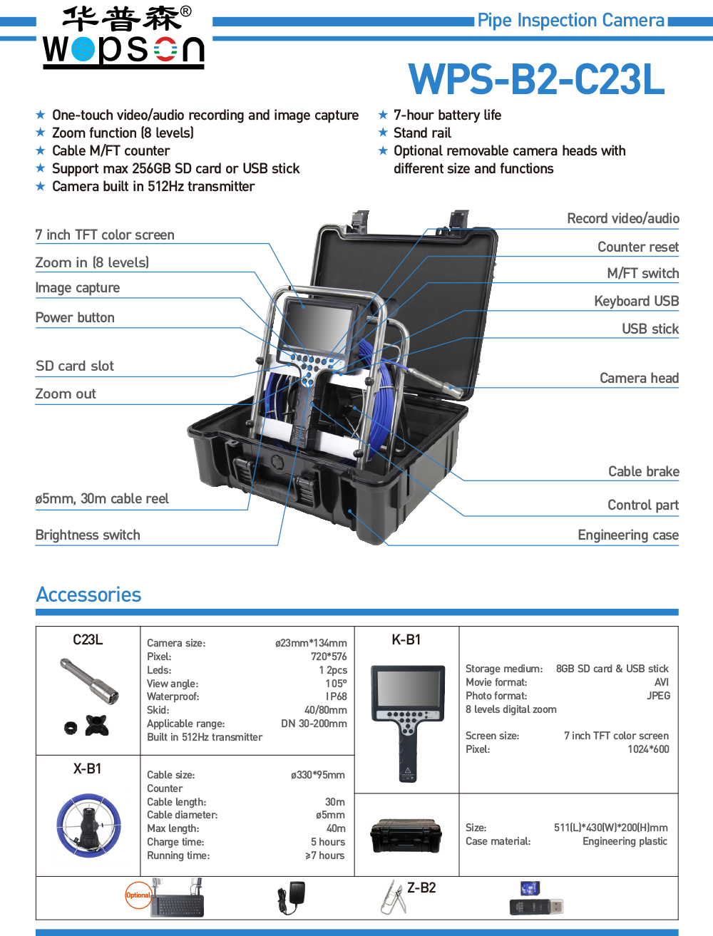 Home > Products > Pipe inspection camera > Dia 30-300mm pipes B2-C23L