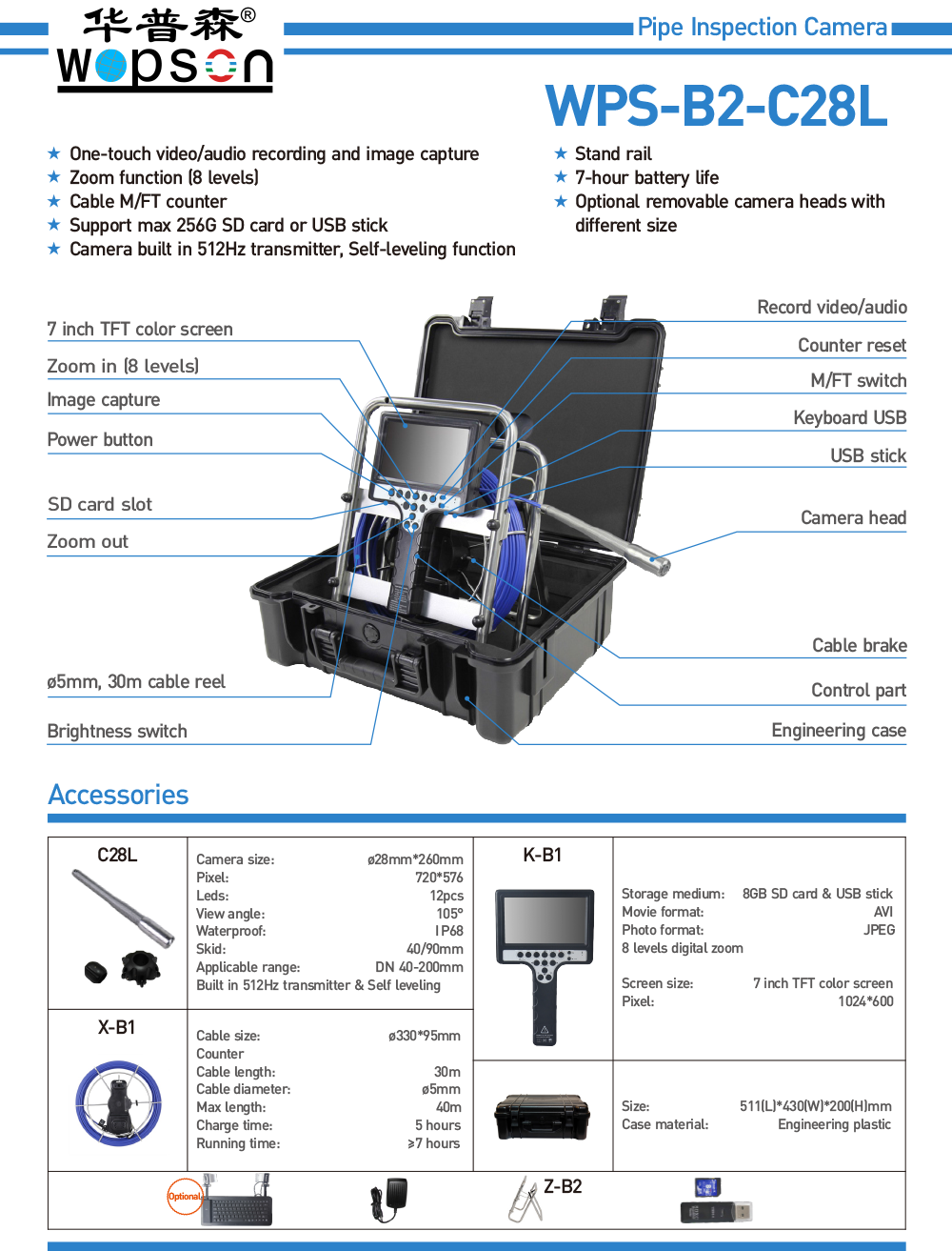 Home > Products > Pipe inspection camera > Dia 30-300mm pipes B2-C28L